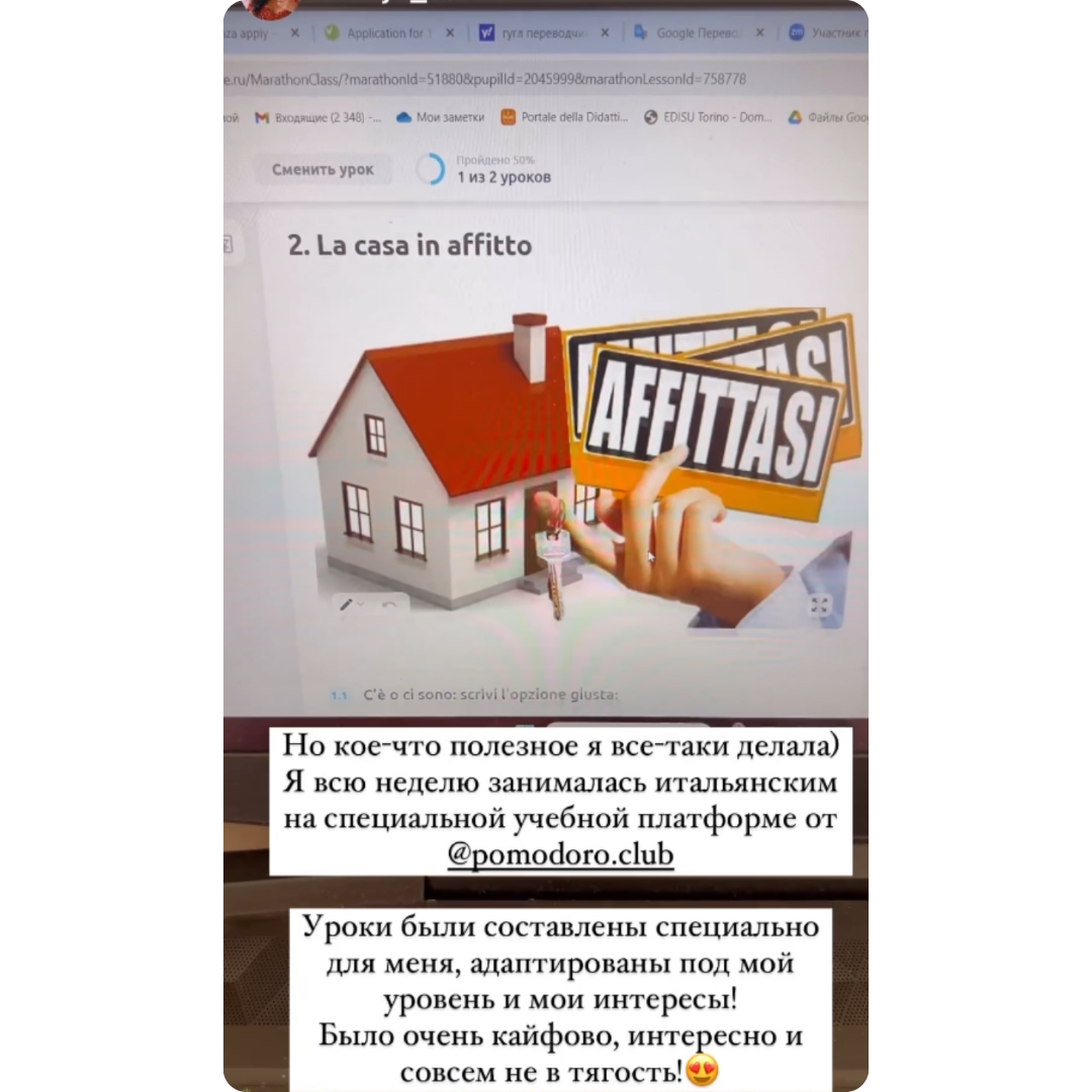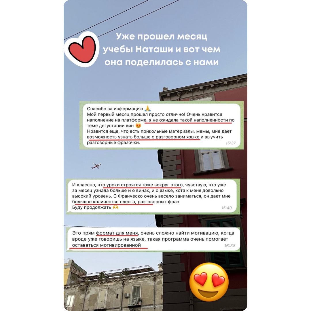 | На начальных этапах эффективнее заниматься с русскоговорящим преподавателем А с преподавателями, которые живут в Италии и имеют опыт работы и учебы в стране, ты сможешь получить максимум эффективности от курса: узнать об аутентичной итальянской жизни, занимаясь в комфорте. Курс создан основательницей школы Помодоро, Женей, которая живет в Италии уже более 8 лет и обучает языкам более 10 лет. |