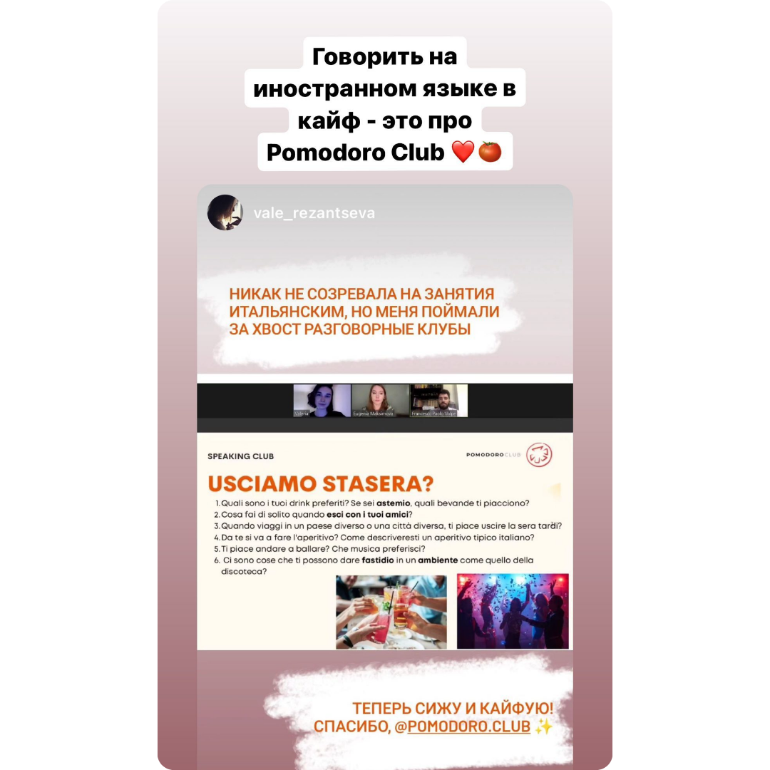 | Мы создали Pomodoro Club для тех, у кого большие планы на жизнь. Pomodoro club – образовательный проект для изучения языков, созданный девушками, влюбленными в общение и культуру стран мира, для таких же как они сами: целеустремленных, проактивных, открытых миру, новым знаниям и возможностям. Это проект для тех, кто ценит свое время, умеет ставить перед собой амбициозные цели и идти к ним. |